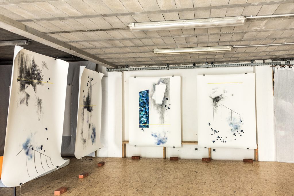 En nous interrogeant sur le territoire du rêve et en allant chercher la matière du réel, nous voulions traiter de cet espace-temps entre l’éveil et le sommeil. Nous cherchions à entrer dans l’intime du rêvé, là où se joue et se rejoue, sans chronologie, sans frontière, l’expérience. Dans ce contexte, nous avons réalisé au Plongeoir des dessins avec pour dimension, 190×90 cm – en référence à la taille d’un lit une place. Ces dessins ont été exécutés selon un protocole bien précis, l’envie étant de s’associer et de ne pas être dissociées. Nous ne pouvons donc pas distinguer l’intervention de l’une ou de l’autre. Il n’y a pas la facture d’un artiste mais la présence d’une image, d’une série d’images dont l’architecture leur est propre et l’horizon autant instable qu’autonome.