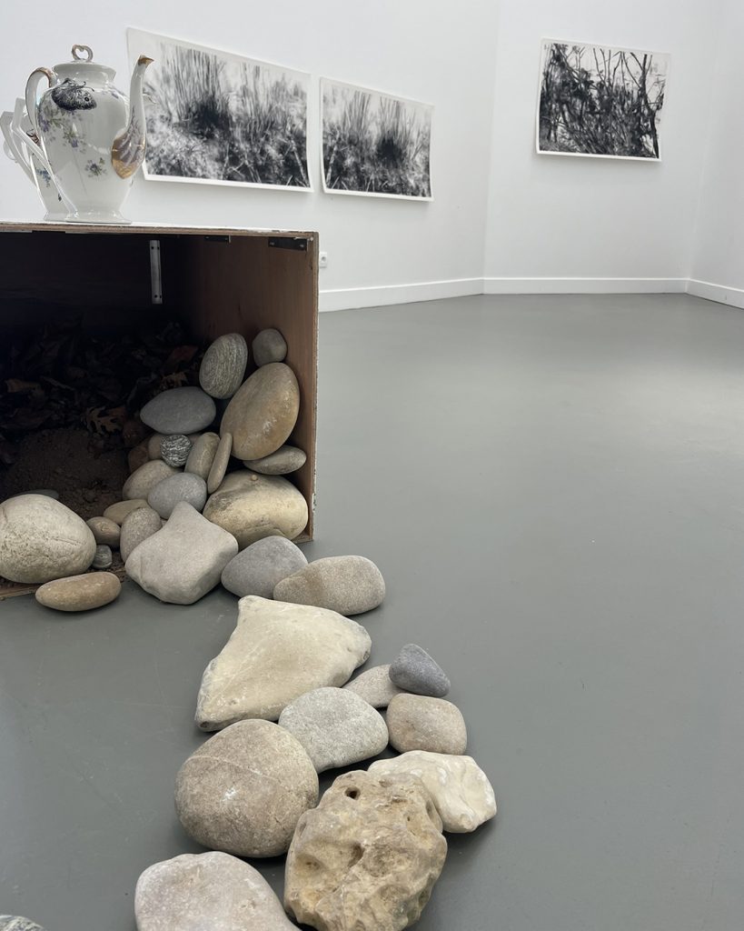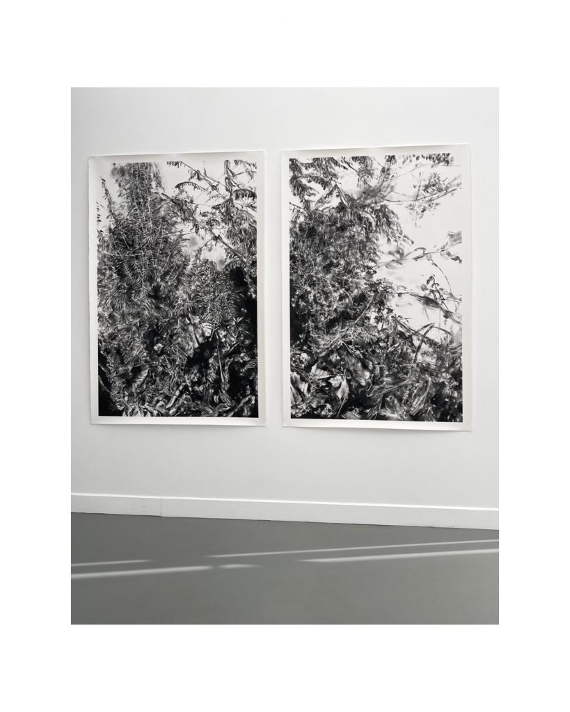 C’est aussi un jeu, une exploration du visible qui flirte avec l’imaginaire : le regard interroge la nature, la façon dont nous la percevons, dont nous la filtrons et la transformons. Au sein des dessins, les éléments semblent sur le point d’apparaître ou de disparaître, offrant un temps qui s’étire, comme on perçoit le roulement des cailloux dans l’eau lorsqu’on tient un galet, ou lorsque l’on observe l’ondulation de l’eau lorsqu’elle est dérangée. Le regard du spectateur est invité à circuler librement, à se perdre dans ces espaces où la matière du dessin devient elle-même un territoire à arpenter, où l’ombre et la lumière construisent des récits inachevés.