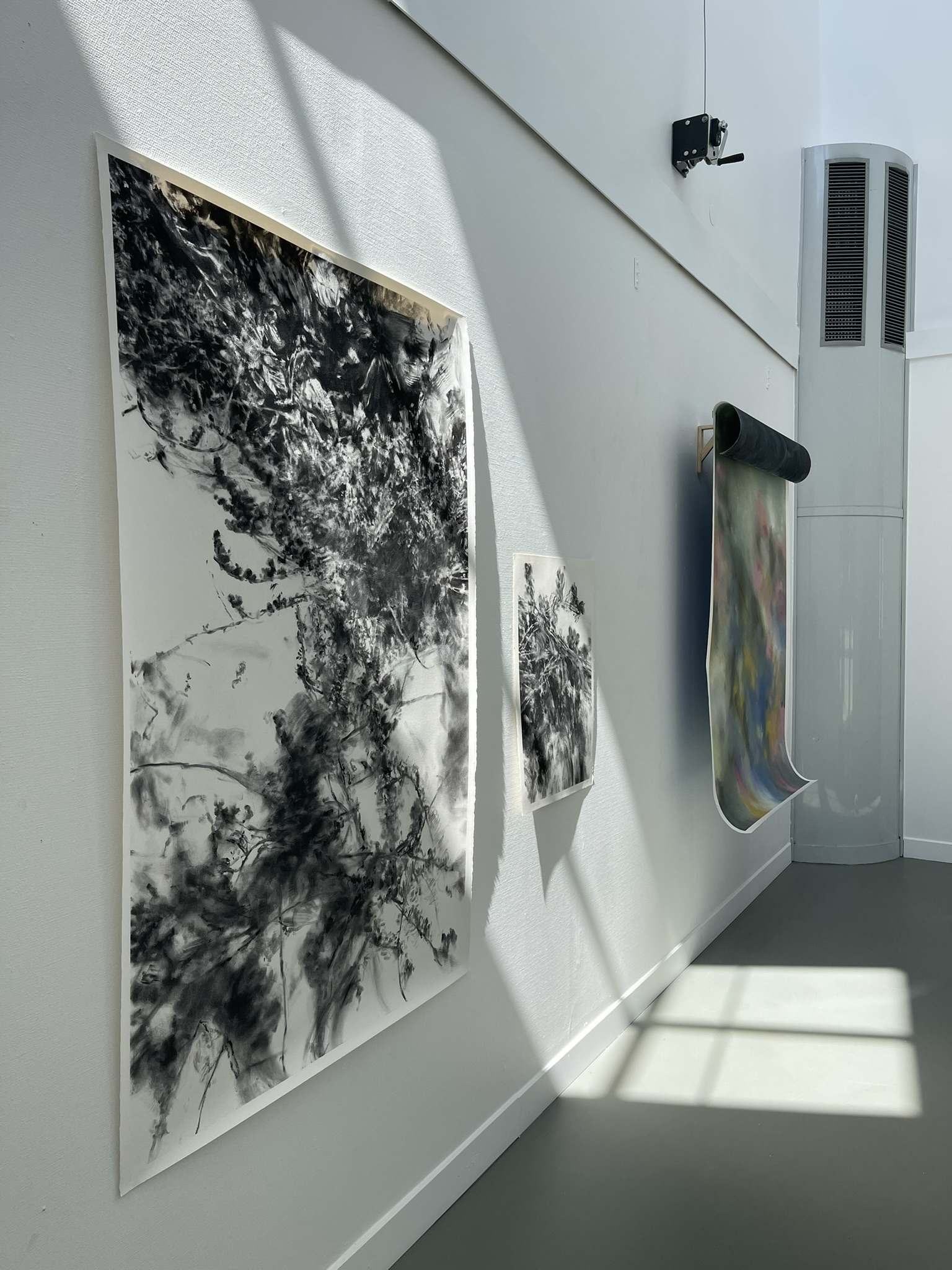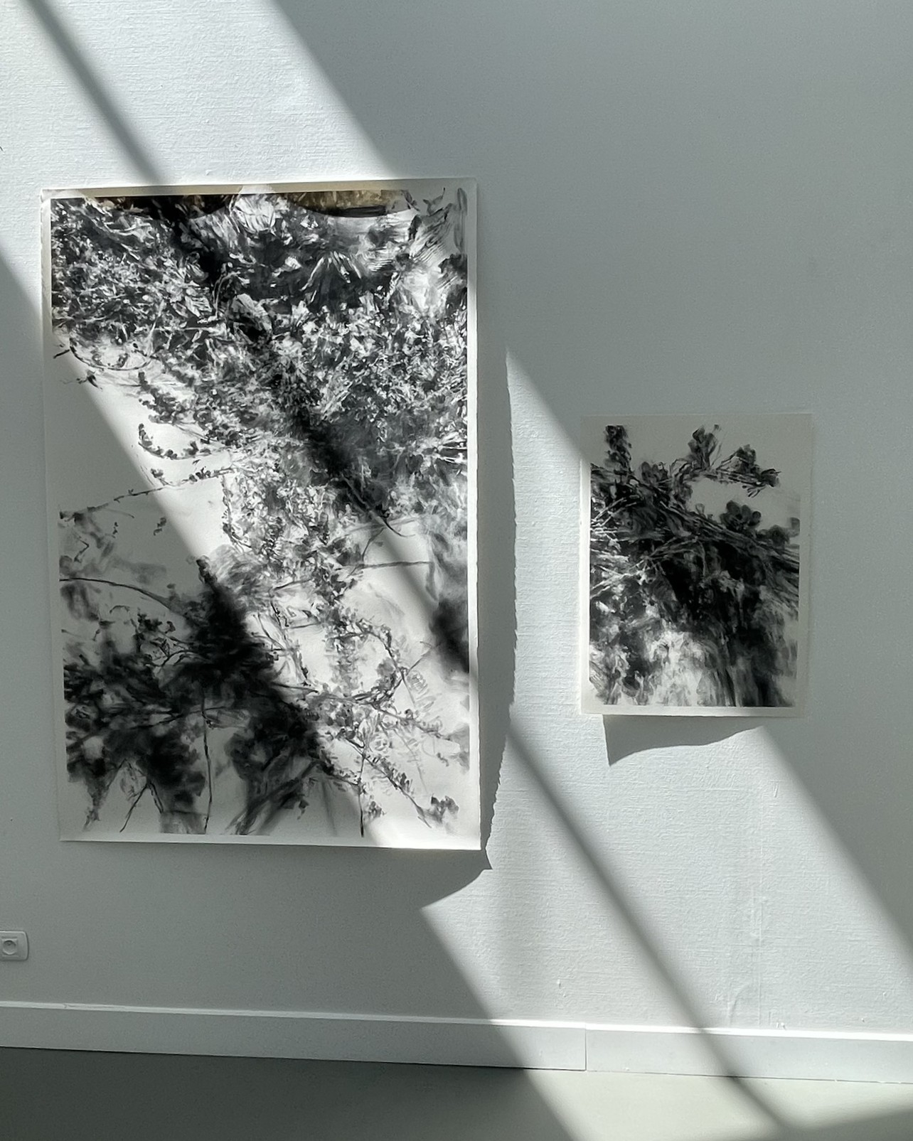 C’est aussi un jeu, une exploration du visible qui flirte avec l’imaginaire : le regard interroge la nature, la façon dont nous la percevons, dont nous la filtrons et la transformons. Au sein des dessins, les éléments semblent sur le point d’apparaître ou de disparaître, offrant un temps qui s’étire, comme on perçoit le roulement des cailloux dans l’eau lorsqu’on tient un galet, ou lorsque l’on observe l’ondulation de l’eau lorsqu’elle est dérangée. Le regard du spectateur est invité à circuler librement, à se perdre dans ces espaces où la matière du dessin devient elle-même un territoire à arpenter, où l’ombre et la lumière construisent des récits inachevés.