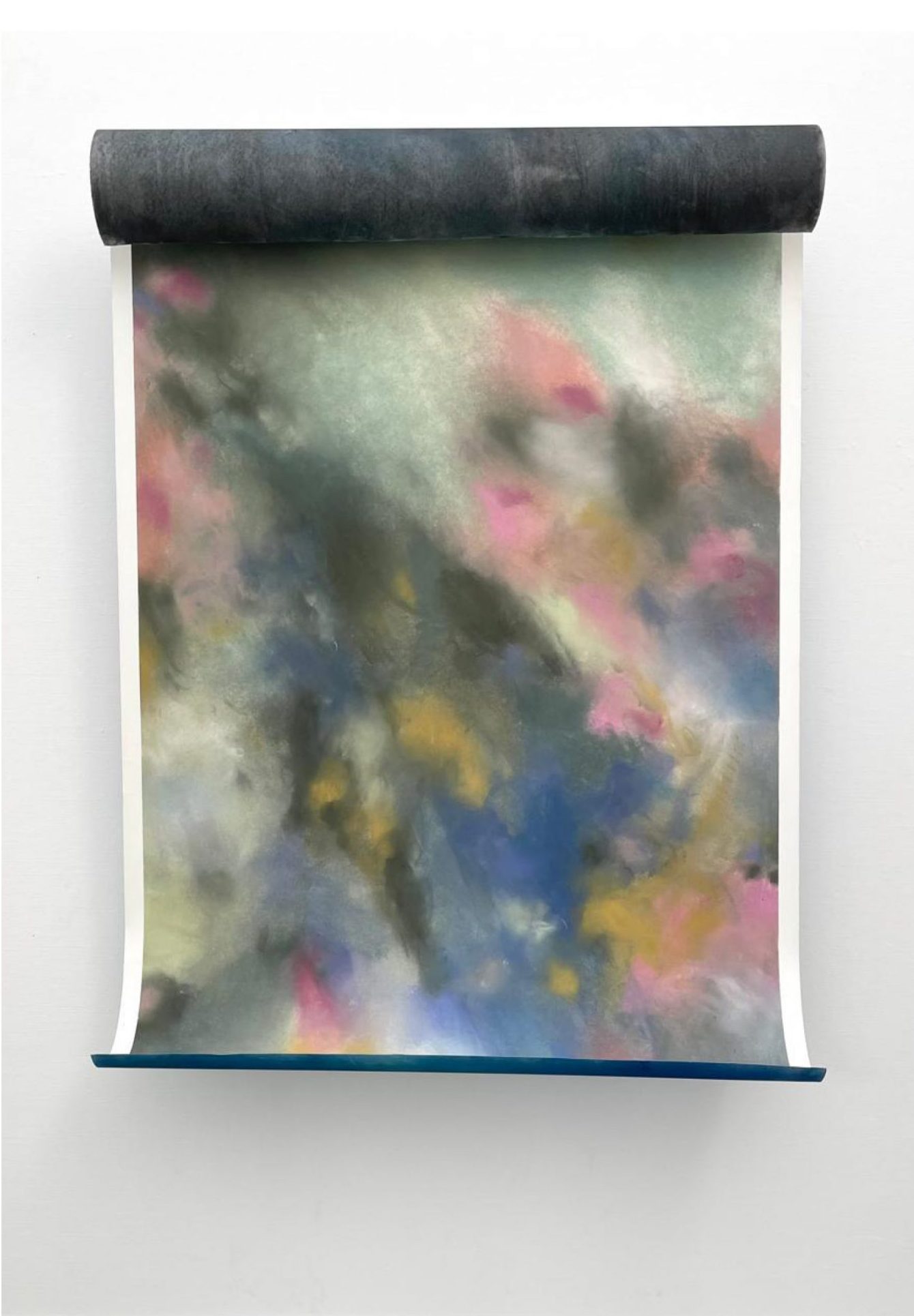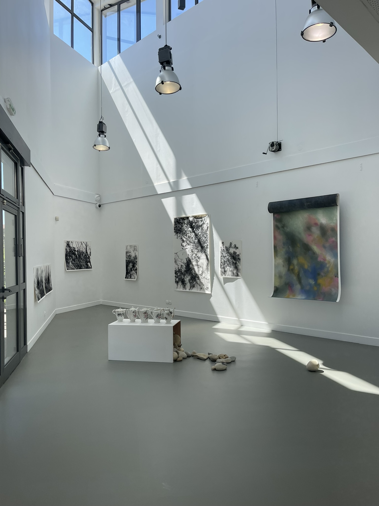 L’exposition réunit des dessins sélectionnés principalement dans 3 séries où le trait noir domine, qu’il s’agisse de fusain ou d’encre appliquée sur des objets anciens. Le pastel vient entrer en résonnance avec les images réalisées au fusain, apportant des réverbérations lumineuses et colorées, rappelant également les couleurs des motifs sur les objets en céramique. L’ensemble explore la matière du paysage et la manière dont il se révèle à travers le regard : flou ou net, fragmenté, ancré dans le réel ou glissant vers l’abstraction.