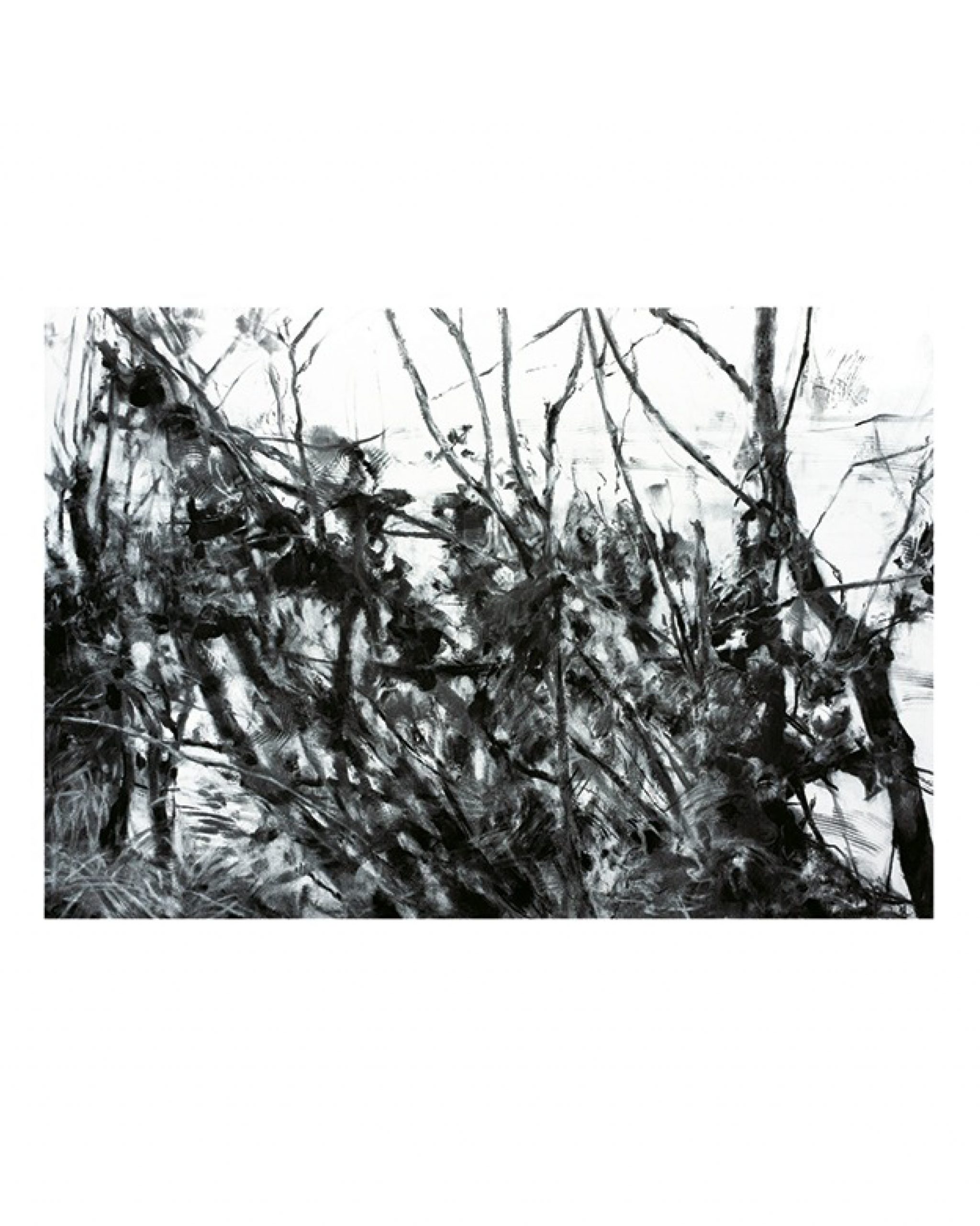 À travers ces dessins, l’univers des sous-bois se dessine et apparaît comme un motif récurrent : entre nature et culture, imprégné d’une certaine iconographie visuelle et du sauvage. Ces paysages, qu’ils soient traversés par l’eau des lônes, éclairés artificiellement dans la nuit urbaine ou tracés sur la porcelaine, suggèrent une oscillation entre l’organique et l’artificiel.